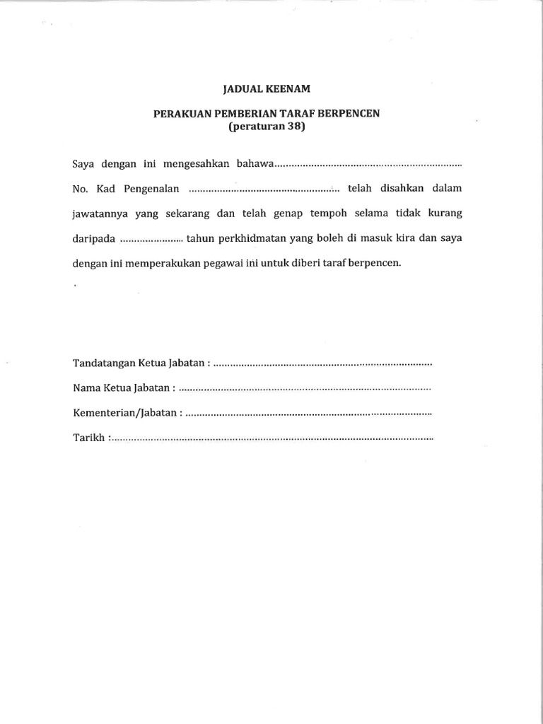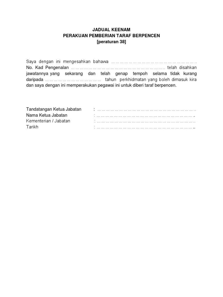 4 Jadual Keenam Perakuan Pemberian Taraf Berpencen Pdf from imgv2-2-f.scribdassets.com People interested in borang taraf berpencen also searched for. Borang permohonan pencen dan gantian cuti rehat (gcr). Borang pemberian taraf berpencen (1). Perakuan pelanjutan tempoh percubaan (lampiran a) borang lampiran a yang digunakan bagi permohonan untuk perakuan tempoh percubaan. Adakah keluarga seseorang pegawai yang telah diletakkan di atas penjawatan berpencen layak menerima kemudahan rawatan percuma selepas kematian pegawai itu? Muat turun borang tajaan / pelajar. Borang dan dokumen yang diperlukan adalah seperti di di. Pekerja sektor awam boleh membuat pengeluaran sekali sahaja sebelum umur 55 tahun setelah diberikan taraf pekerja berpencen.